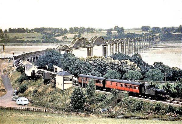 Looking south across the River Severn in July 1959, 14XX Class 0-4-2 1426 heads south west towards Lydney having called at Severn Bridge station. The GWR 1400 Class was designed by Charles Collett to be used as a lightweight locomotive on branch line passenger duties. They were an advancement of the earlier 517 class and were originally numbered as 48xx. Some were converted to oil firing and kept the same numbering, with the unmodified locomotives changing to the 14xx designation. The 14xx locos were designed to work with the GWR's specialist 'autocoach' which enabled push-pull working and the class proved to be highly successful on these workings. 1426 was built in November 1933 and withdrawn from Gloucester LMS shed in April 1962.