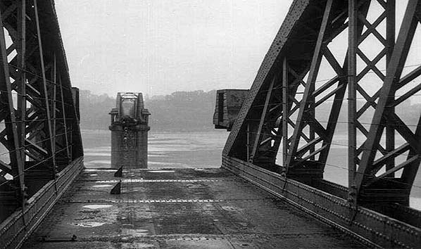 Two bridge spans collapsed into the river after two fuel tankers hit one of the bridge piers on 25 October 1960. This view is May 1964, compare with the picture above taken the day after the collision.
