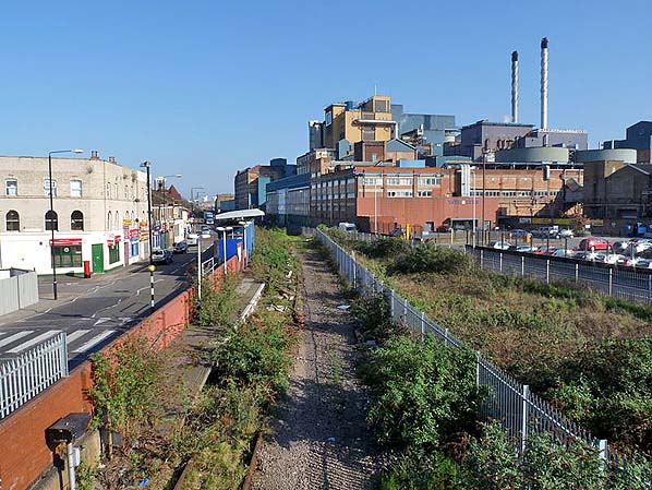 Silvertown station looking towards North Woolwich in March 2011. Weeds have taken over the track bed and the platform. Photo by Chris McKenna reproduced from Wikipedia under creative commons licence