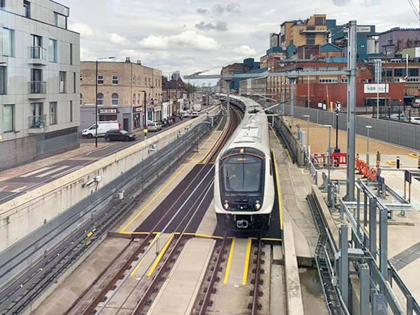 Crossrail Abbey Wood to Paddington test train passing through the site of Silvertown station in May 2021.