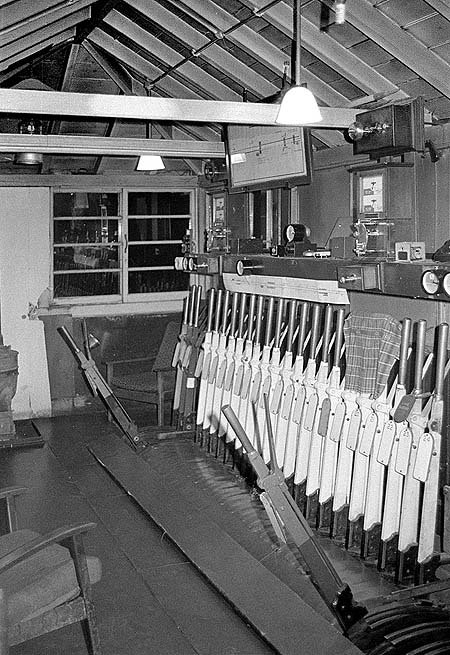 The Saxby & Farmer from at Six Mile Bottom signal box in November 1975. The two block instruments are seen above the frame. The Fulbourne - Six Mile Bottom block instrument is at the far end by the window. The Six Mile Bottom - Dullingham block instrument with the bell mounted above it is on the wall behind the track plan. The shorter levers at the far end of the frame usually controlled electrically operated equipment.