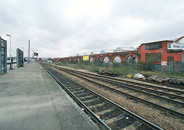 The Maypole Dairy railway loading shed seen from the disused Brentford branch platform at Southall station in March 2013.