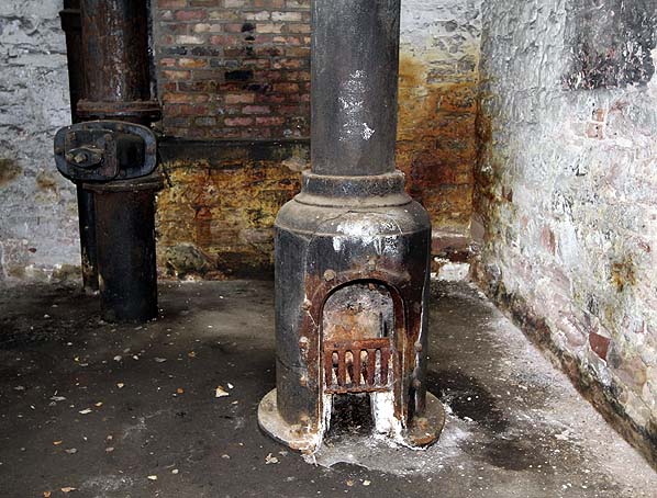 ![]() Stove inside the water tank tower in May 2011. The big pipe is the main supply for the overhead tank, the second small pipe in the background is probably the overflow drain in case the ball valve fails. Photo by Nick Catford