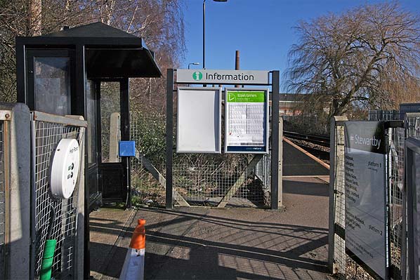 ![]() Station Name: STEWARTBY Station still open but included for completeness ![]() Stewartby station entrance to the down platform in February 2014. The ‘bus shelter’ is approximately on the site of the earlier wooden shelter.