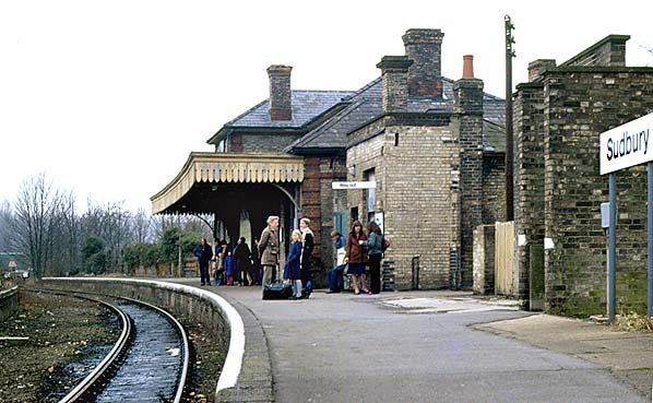 Passengers wait on Sudbury station for a train to Marks Tey in February 1982. British Rail corporate identity signage has at last been installed at the station. Photo by Alan Young