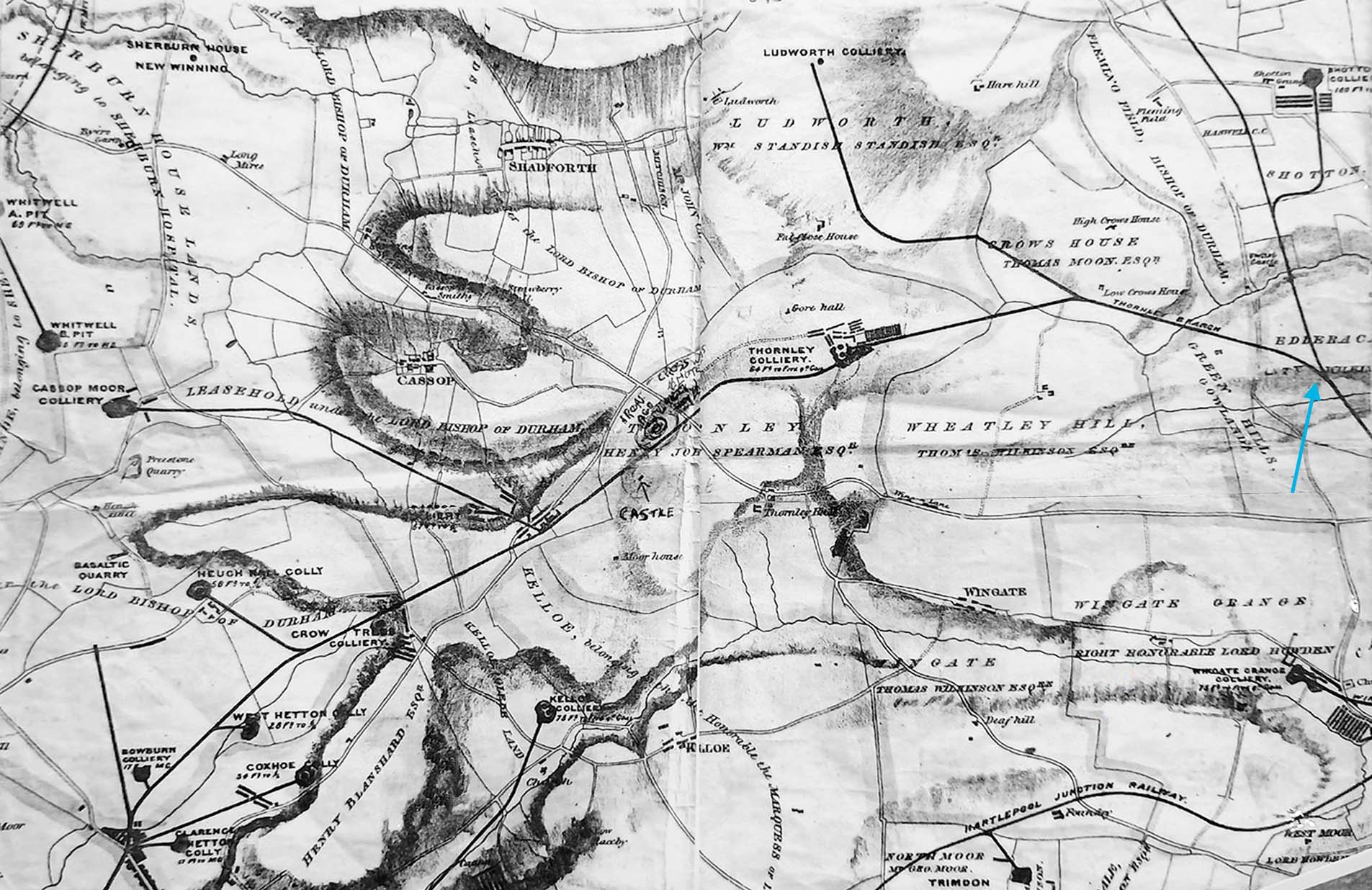 ![]() Thornley branch before Thornley station opened. The blue arrow shows Thornley Junction, where the station would eventually be. The branch served a number of collieries, most of which had closed by 1900 leaving only Wheatley Hill, Thornley and Ludworth. Wheatley Hill is not shown. It opened in 1869 so the map must be earlier.