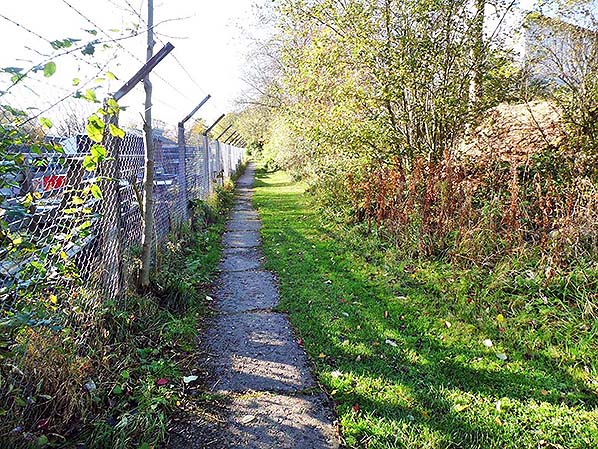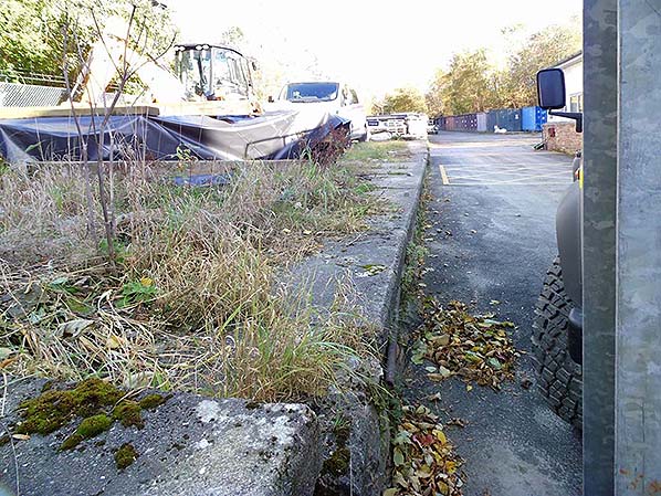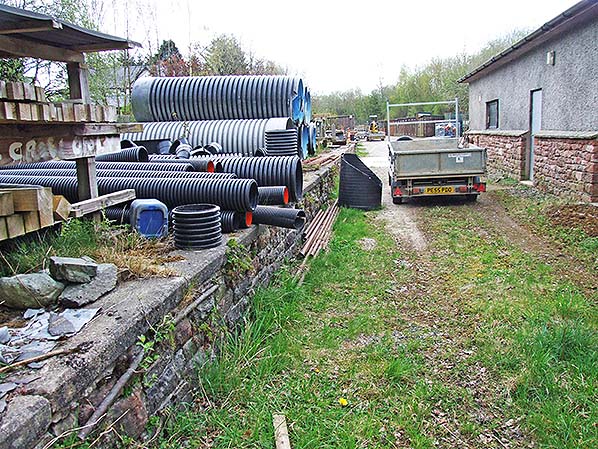 The site of Threlkeld station and goods yard looking east in October 2019. Note the footpath along the left side of the Threlkeld Depot site. This follows the track bed and some edge stones from the up side of the island platform are visible.