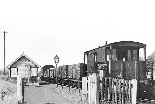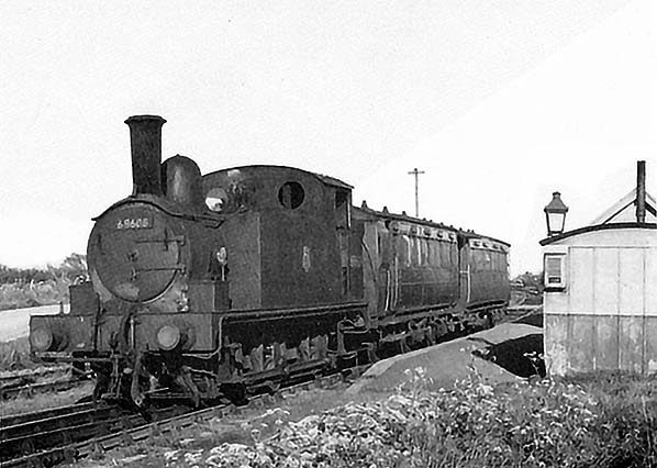 Class J67 No. 68608 waits at Tollesbury with a mixed train. She carries the early 'Cycling Lion' device which was the British Railways variant of the then standard British Transport Commission device. Only one point of passenger access is at the platform, this being necessary with mixed trains to avoid the rear fouling the level crossing. Both grounded carriage bodies are visible, with that on the left having a small hut placed against its end. It has a flue and therefore contained a stove but why this was thought necessary and with the hut apparently an appendage to the carriage body is not known.