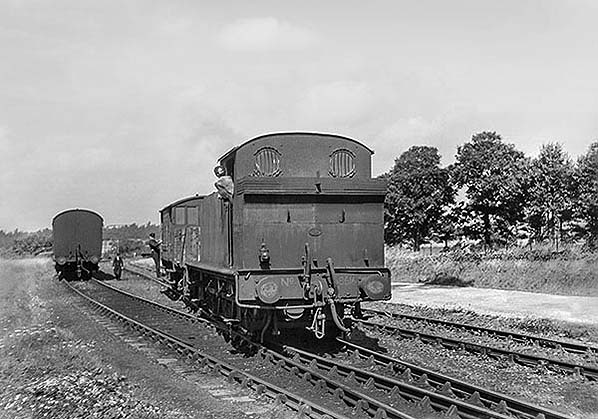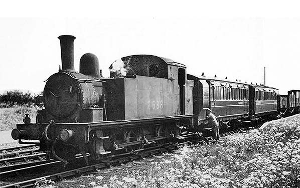On 19 September 1950 LNER liveried Class J68 No. 8638 waits at Tollesbury with a mixed train. The two passenger vehicles are E62261 and E60462. Class J68 was a later Alfred Hill variant of James Holden's Classes J67 and J69. Both of the latter began life as GER Class R24 whereas J68 began life as GER Class C72. The only sign of life in this scene is a member of the footplate crew conversing with the conductor-guard.