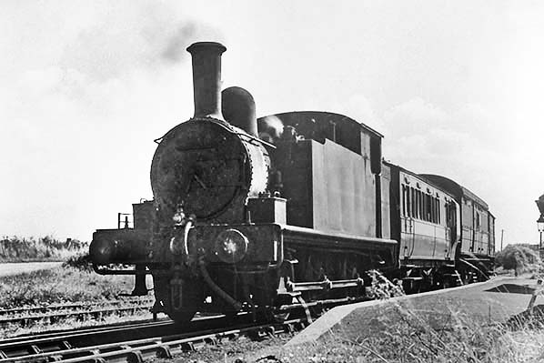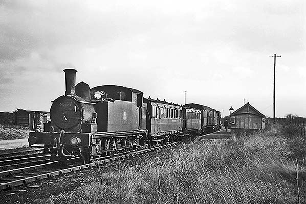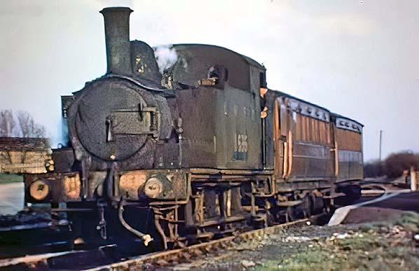 Class J67 No. 68616 waits at Tollesbury with a mixed train for Kelvedon. The period will be the latter half of 1950 when this locomotive was allocated to Colchester shed and was a regular performer on the line. The mixed formation is typical; one ex-Stoke Ferry and one ex-Wisbech carriage, the Full Brake and some goods vehicles at the rear. Despite the passenger cars being fitted with additional steps, boarding and alighting was still very much a case of "mind the gap". People rarely made a fuss over this sort of thing in those days; in the postwar period there was an attitude which went something like "Hitler was unable to finish me off so I'm damn sure [this or that] won't". It was both commendable and unsurprising. By the time of this photograph, Tollesbury station was looking decidedly neglected and the grounded body on the left shows signs of being repeatedly patched up. Of interest is that in an earlier life it was one of those carriages with a half compartment at one end, on the right in this case. Such carriages were quite common and the half compartment had just one seat across the width of the compartment instead of the more usual two facing each other. Passengers sat in these narrow compartments staring at a solid wall although there may have been a mirror and/or a couple of watercolours to stare at.
