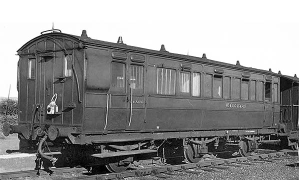 Brake Third British Railways No. E62262 seen here at Tollesbury. This vehicle began life in 1896 as a First/Third Composite and became No. 10 on the Stoke Ferry branch. When transferred to the Kelvedon & Tollesbury it was converted to a Brake Third and modified to suit, to a point, the low platforms of the light railway. At some point in time it was renumbered to 63355 and then to 62262. It is thought to have arrived at Tollesbury still numbered 63355, gaining its final number soon afterwards. By design or coincidence, with the exception of the ex-Wisbech 4-wheelers which had their own 604xx number sequence the stock which survived on the line until 1951 were all numbered in the 6xx61 and 6xx62 sequences. The conversion to 24-seat Brake Third saw the van section occupying what had been the First Class area, the giveaway being the larger window to the right of the van doors. There were originally two of these windows, with a single door and narrower window where the ducket was fitted. This vehicle also underwent the same modifications as with No. 62261 to lower its height. The steps and curved handrail on the end of the vehicle were to access the roof and lighting. This vehicle was withdrawn in October 1951.