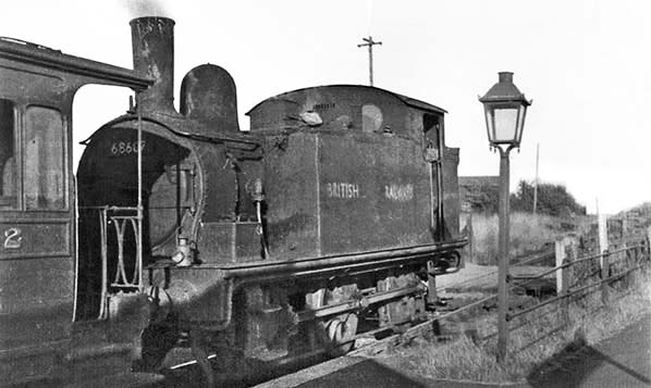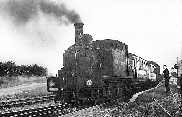 Class J67 No. 68607 awaits departure from Tollesbury. She was renumbered from 8607 in December 1948 but still carries the interim 'BRITISH RAILWAYS' on her tanks. The photograph possibly dates from the late 1949 - early 1950 period when the locomotive was allocated to Colchester.