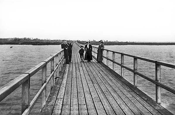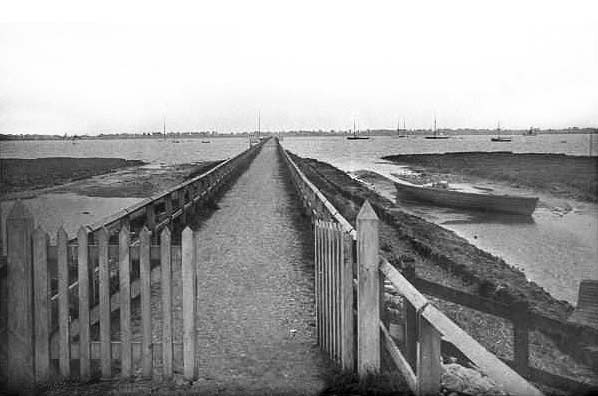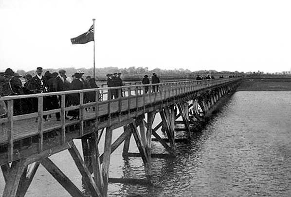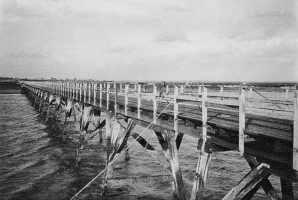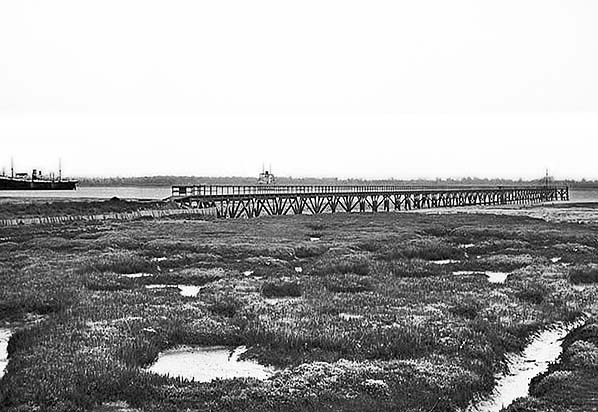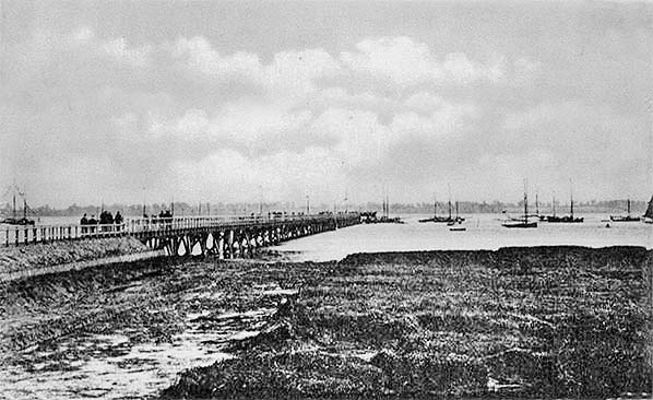 Copyright photo from John Alsop collection ![]() The causeway leading onto the pier soon deteriorated but is seen here, left, in very good condition so this view likely dates from no later than 1910. In the river are a number of yachts, sailing barges and smaller craft while it appears quite a crowd has assembled on the pier head. The scene depicts what the GER hoped would become a thriving yachting resort but what we see here is about as good as it ever got.