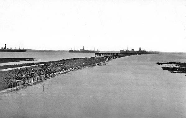 Photo from John Mann collection ![]() In this view the railings along the causeway have disappeared, allowing us to better see the ramp between causeway and pier. Why this ramp was provided is not clear but it may have been to allow for, or maybe provided as the result of, settlement. The ship on the left looks very much like the SS Baltriger which was laid up in the Blackwater between October 1929 and August 1931. Assuming this is the vessel we thus have a date window for this photograph. The Baltriger, built at Copenhagen in 1917 as the St. Croix, came into the ownership of the United Baltic Corporation in 1920 who renamed her Baltriger. She was again sold in 1933 to the Stavanger Steam Ship Co. who renamed her Ryfylke. Her eventual fate was to be requisitioned by the Germans in April 1940 and sunk by HMS Sealion (an S Class submarine, Pennant Number 72S) in the Norwegian Sea on 5 February 1941. All onboard were saved.