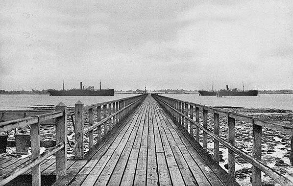 Photo from John Mann collection ![]() On this occasion it was high tide and to the left is the causeway which led to the pier from Pier railway station. Also visible is the ramp linking causeway to pier, probably provided to allow for settlement of the causeway, the pier or both. More laid-up shipping can be seen and again some details, albeit often patchy, can be found on the Mersea Museum website linked to on the branch history pages.