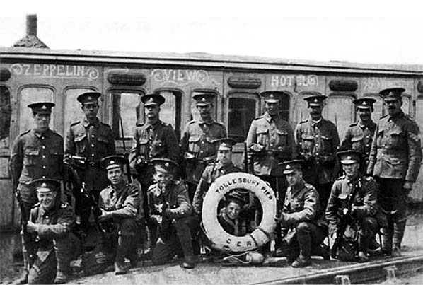 Photo from John Mann collection ![]() The Zeppelin View Hotel, 2/8 Worcesters at Tollesbury Pier in 1915. A little more information can be found in the main text. What is not known is if the carriage body was the second example to be placed at Pier station, more or less opposite the station building, or if it was a third provided specifically for the Worcesters and removed at the end of the war. Note the GER lifebelt, no doubt 'borrowed' for the photograph to identify the location despite the caption which would have been added subsequently. In the First World War there was not the urgency to conceal locations as there was in the Second.