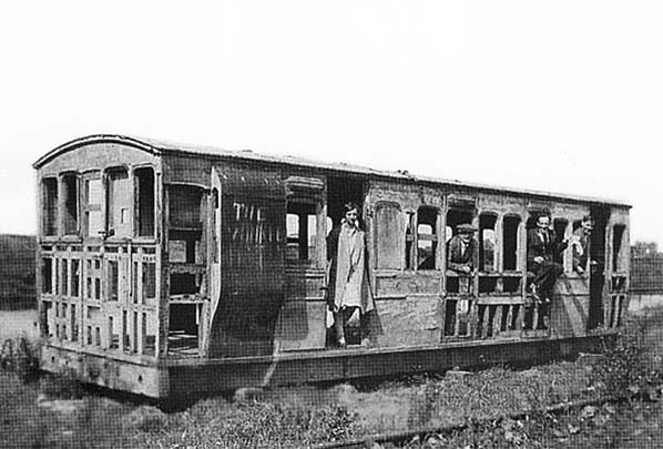 Photo from John Mann collection ![]() Compared to the other photograph showing the skeletal remains of the carriage body (below), this view is from a little earlier as some of the body's panels and beading are still present. Somebody has written 'The winkle hut' on the ducket and no doubt the body was used by fishermen for one purpose or another. It would appear some notices had been fixed inside the body, visible to the left of the ducket. Who the group of people are is not known; perhaps a family or group of friends out for a stroll. One thing they were not is fishermen (a lady is also present) as their attire makes that fairly obvious. When still in service the carriage was a three-compartment Brake Third and is broadly similar, but not identical, to No. 62261 before conversion for conductor-guard working.