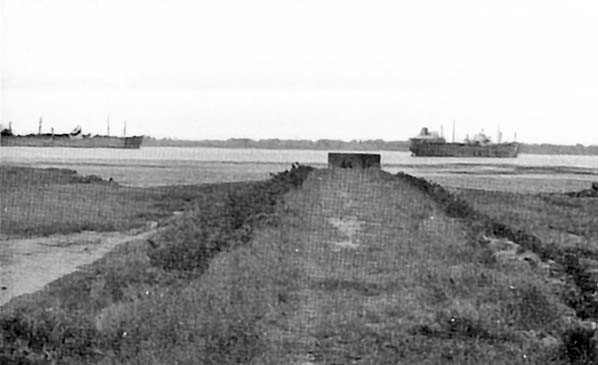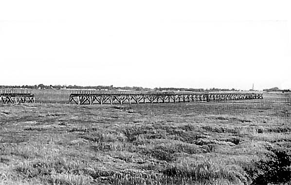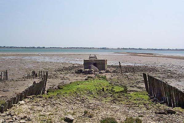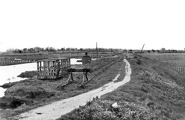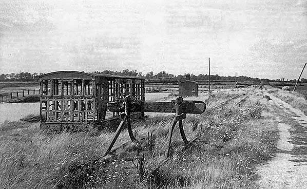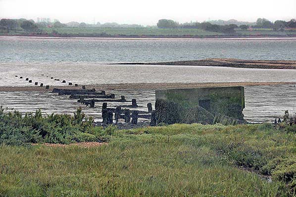 survive to this day. Photo from Jim Lake collection ![]() Looking along the causeway towards the site of the pier in 1962. Sleeper indentations are still just about discernible some ten years after the track was finally lifted. The World War Two pillbox was originally on the causeway but erosion, its own weight and by no means least the 1953 floods have seen it relocate itself onto the mudflats. It is described in more detail in other captions. Photo by Lorraine Duffy ![]() In this view from July 2005 the camera is looking along the alignment of the former pier. The stumps actually still exist for some distance into the river below the surface (this view was taken during low tide) and are still visible from the air. In the foreground it is very evident how the causeway has been washed away, leaving the pillbox to slowly sink into the mud. The wooden shuttering, left and right, was to protect the causeway from the water. Originally it was at the foot of the causeway embankment. Today at high tide the pillbox is partially submerged. 'Pillbox' is a universal nickname for what is properly termed an 'Infantry Blockhouse'. At one time people requiring tablets would go a chemist shop where the tablets would be made up by the chemist from ingredients held in stock. The completed tablets would then be handed to the customer in a little box, usually but not always circular and made from card which was often waxed to protect, one hoped, the contents from damp. It was from these little boxes that the nickname for these military structures was derived. The Tollesbury pier pillbox is to the irregular hexagon FW3/24 design, usually referred to more simply as 'Type 24'. They had seven loopholes, two in the rear wall which was the widest with one loophole either side of the entrance. The remaining five walls had one loophole each. Internally there was an anti ricochet wall; with Type 24 this was usually 'Y' shaped. Which weapons this particular pillbox was intended to accommodate is not known and could have been anything from the Lee-Enfield .303 to a light machine gun, for which latter gun mounts would have been fitted.