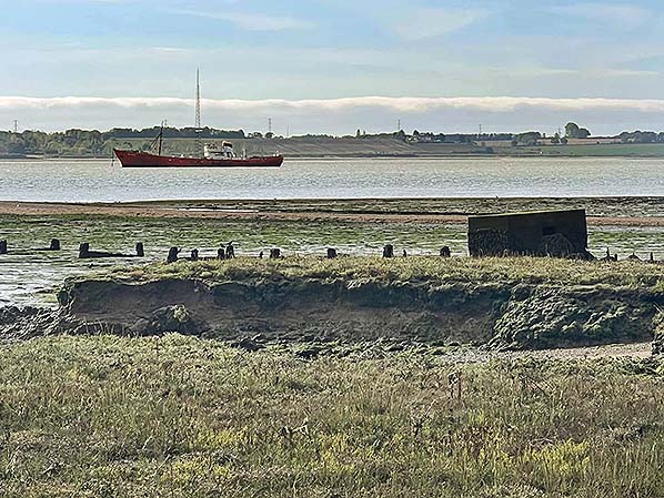 Photo by Anthony Whitehead ![]() The subject of this photograph from around 2020 is the vessel at anchor in the river. She is the MV Ross Revenge, a former trawler which will be familiar to many people as the home of Radio Caroline. She had replaced the MV Mi Amigo, a former schooner which broke anchor and drifted onto Longsands Bank where she sank. In very shallow water, the wreck still lies at the site some fifteen miles east of Foulness. Some readers may wonder why Ross Revenge is not visible in other photographs of the pier remains and the answer can be found by looking at the stumps of the pier (with some cross bracing still present) which run roughly left to right across the scene. Ross Revenge is actually anchored a little further upstream and the pier ran on a south-easterly alignment, the camera is thereforeThe subject of this photograph from around 2020 is the vessel at anchor in the river. She is the MV Ross Revenge, a former trawler which will be familiar to many people as the home of Radio Caroline. She had replaced the MV Mi Amigo, a former schooner which broke anchor and drifted onto Longsands Bank where she sank. In very shallow water, the wreck still lies at the site some fifteen miles east of Foulness. Some readers may wonder why Ross Revenge is not visible in other photographs of the pier remains and the answer can be found by looking at the stumps of the pier (with some cross bracing still present) which run roughly left to right across the scene. Ross Revenge is actually anchored a little further upstream and the pier ran on a south-easterly alignment, the camera is therefore here facing due south. here facing due south.