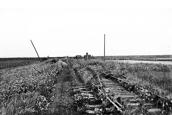 Photo from John Mann collection ![]() The site of Tollesbury Pier station on 18 May 1935 looking towards the pier. The sea wall runs left to right in the background. As can be seen, the points to the run-round loop were extant.