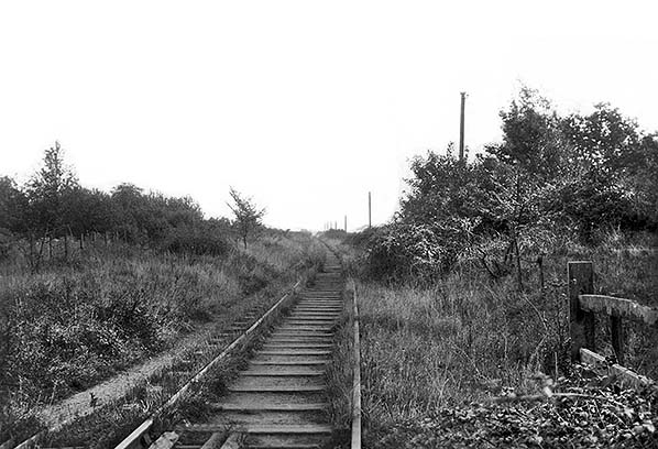 Copyright photo by HR Norman from John Alsop collection ![]() Looking towards Tollesbury Pier. The fence on the right and the cattle guards, or rather the remains of them, centre bottom tell us the photograph was taken from a level crossing. A little research reveals the location to be Woodrolfe Road crossing. Beyond the curve the line ran dead straight to Pier station. Clearly the four foot (the space between the rails) was a well used footpath with another along the Down side of the line. This will be another of the many photographs taken along this nominally disused section of line taken during the 1930s. This and the two above were postcards.