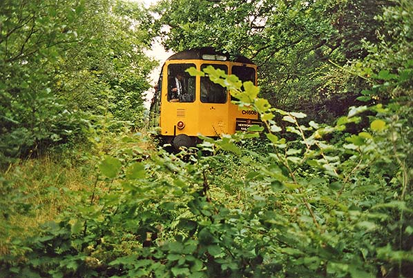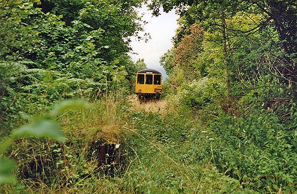 Photo by Dave Plimmer from his Main Line Railways Of North Wales web site ![]() Another view of the 20 August 1989 railtour. The DMU had crept right to the very end of the line. What remained of the halt was by this time well hidden by nature. 'CH608' on the front of the DMU means Chester-based unit No. 608.