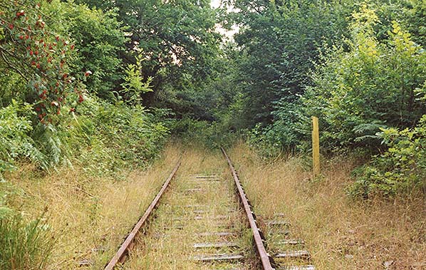 Photo by Dave Plimmer from his Main Line Railways Of North Wales web site ![]() The end of the line on 27 August 1989, a week after the raitour. The platform and buffers are not visible due to the undergrowth. It is believed the railtour did reach the platform but could not run up to the buffers. Milepost 19 (measured from Bala Junction) is seen on the left. The end of the line is 18m78ch from this post.