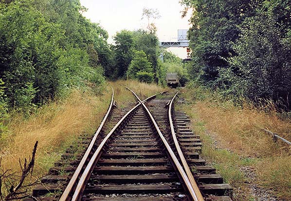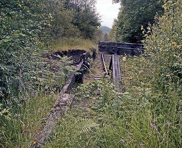 Photo by Dave Plimmer from his Main Line Railways Of North Wales web site ![]() The junction with Reservoir Siding on 27 August 1989. The overgrown track to Trawsfynydd Lake Halt is on the left. A week earlier the 'The Trawsfynydd Flyer' railtour had penetrated the undergrowth.