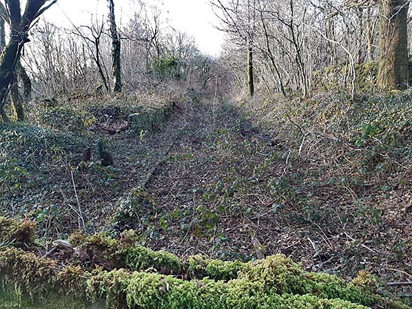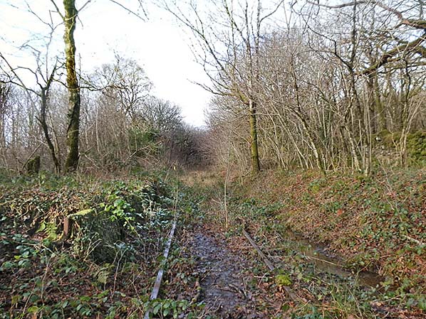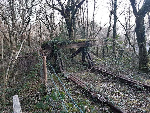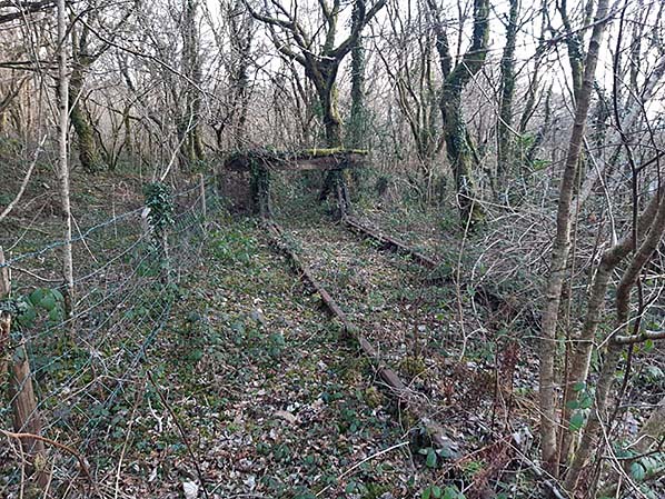 ![]() Looking north towards Trawsfynydd Lake Halt fro0m the buffers in March 2021. The surviving overgrown north end of the platform can be seen in the middle distance. The cinder and ash infill at the south end has been removed or has eroded. Some standing timber edge supports can still be seen.