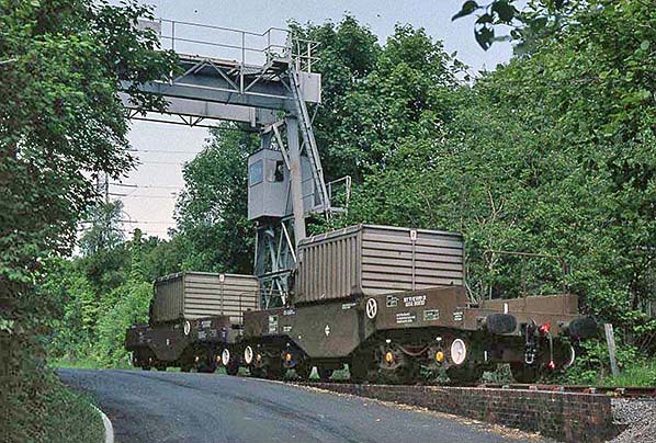 ![]() The loading, or transshipment, area with two loaded flask wagons present in June 1994. This view is facing towards Blaenau Ffestiniog. Note the lorry road in the foreground; provision was made for lorries to turn round so no awkward reversing from the main road was necessary. By this time the nuclear power station had ceased operation and the sole purpose of the railway was the removal of waste from the reactors, this continuing until 1998. The 'Goliath' crane was dismantled and removed from the site in 2005.