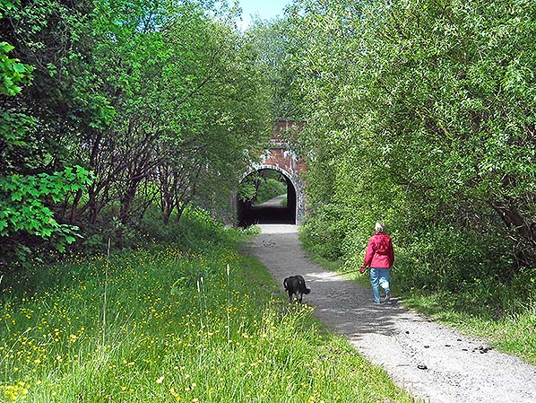 ![]() Looking west on 2 June 2016 at Whitworth Road Tunnel between the stations of Wardleworth and Shawclough & Healey on the former Facit Branch. In the foreground the sidings serving Bright’s Fieldhouse Mills used to branch off to the left; they fell out of use in the 1950s. Much of the trackbed of the former Facit Branch is now maintained as a footpath and cycle route, and on this warm, sunny morning several dog-walkers passed the author on the short stretch between Thrum Hall Lane crossing and Fieldhouse Road. Photo by Alan Young