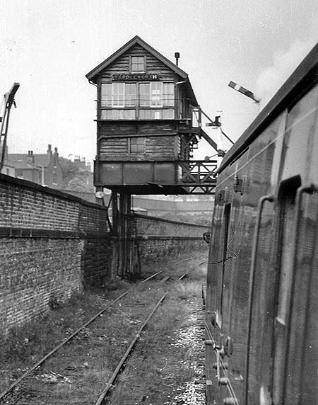 ![]() The gantry-mounted signal cabin at Wardleworth is seen from the Roch Valley Railway Society’s ‘Salford Hundred Railtour’ train to Facit on 28 July 1962. The standard Lancashire & Yorkshire box with its 40-lever frame was constructed in 1899. Photo by Ian G Holt
