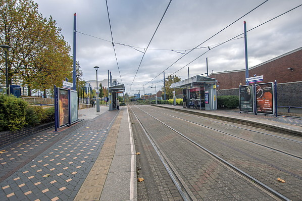 A general view, towards Birmingham, of the clean and well presented tram stop which occupies the station site on 5 November 2016