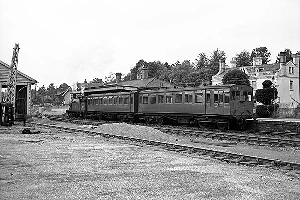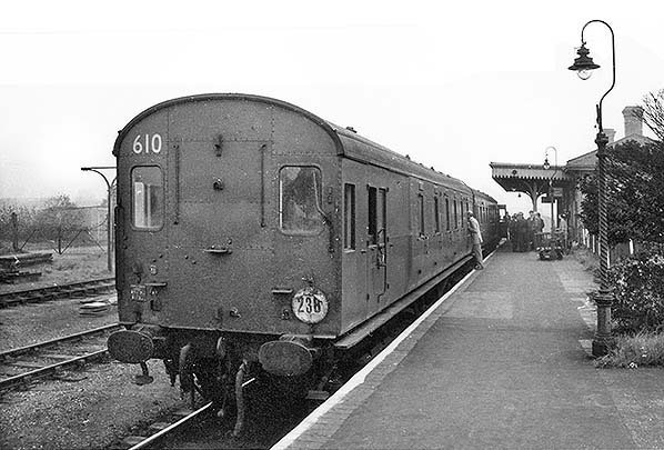![]() A 1950s, probably 1958, view of one of the ex-rail-motor push-and-pull sets at Westerham, on this occasion No.482. It was possibly taken at the same time as the other 1950s view taken from the west. The eight SE&CR rail-motors were converted into 4 x 2-car push-and-pull sets in the 1920s. Sets 481 and 482 were non-articulated, the other pair, 513 and 514 being articulated. The latter pair are not known to have ever operated on the Westerham branch. Apart from the obvious removal of the engine portion and addition of a bogie, the carriages seen above were little changed from their rail-motor form. The slightly narrower outer ends were originally the trailing ends of the rail-motors while the inner ends with single door originally butted directly to the rail-motor engine portion and had a slight roof end overhang which projected part way over the footplate. It could not form a solid, continuous roof over the footplate due to articulation between engine and carriage portions. In the converted form seen above, the carriages enjoyed a life almost thrice that of when in rail-motor form. Dates, especially when only an approximate year is given, of photographs showing these and the replacement Maunsell sets on the Westerham branch can be a little confusing as, it would seem, the two types worked turn and turn about until the full complement of 20 Maunsell sets had been converted.