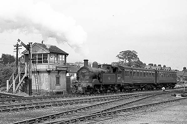 ![]() On 26 October 1958 push-and-pull set 663 waits at Westerham behind the by-then-usual Class H 0-4-4T. Set 663 was one of an interesting batch made up from a mixed bag of vehicles. Some comprised 1 x ex-SE&CR + 1 x L&SWR vehicles while others comprised 2 x ex-SE&CR vehicles, set 663 being of the latter composition (the National Railway Museum notes 663 as being ex-SER but this is somewhat academic). Set 663 was one of a batch which began life as 3-car 'birdcage' sets of, of course, normal configuration. The driving trailer, facing the camera, was originally a 60ft 'birdcage' brake third lavatory while the other vehicle was a 50ft lavatory composite. The lavatories occupied the third compartment and can be seen further along the driving trailer, the equivalent in the composite being obscured by the open door. These ex-'birdcage' conversions seem to have appeared relatively late, being converted during WW2 with identical sets 660 and 661 known to have been converted in 1942. They survived until the end of 1961, being ousted partly by the Maunsell sets converted during the 1950s, line closures and to a perhaps lesser degree by the introduction of diesel-electric multiple units. Of note on the front of the driving trailer at Westerham are the various data plates, left and below the windscreen, and the cumbersome air-operated windscreen wiper which was typical Southern Railway and also appeared on the earlier types of electric multiple unit. These wipers gave a characteristic 'thump hiss thump hiss' sound in operation. On the left the church of St Mary the Virgin is seen.