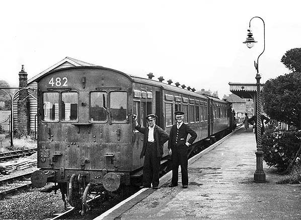 Westerham Station Gallery 6: May 1960 - September 1961 ![]() In May 1960 two cheerful-looking members of staff pose beside the driving cab of push-and-pull set No.482. At first glance there appears to be nothing out of the ordinary about this set until you notice the rather odd bodyside layout. Referring to the image of steam rail-motor No.3, set 482 was that formed from the carriage portions of two railmotors as was a second non-articulated set No.481. Sets 481/2 were formed from the carriage portions of railmotors 4, 5, 6 and 7 although, unlike the articulated conversions, it is unclear which portions were used for which sets. When originally converted from rail-motors, sets 481/2 were intended for the Isle of Wight Railway and were indeed shipped over but were apparently not push-and-pull fitted at this stage. They are known to have operated to Freshwater and Bembridge from 1925 to 1927, in which latter year they returned to the mainland. Quite why they returned to the mainland is not entirely clear as they were to spend the next two years in store until 1929 when they were dusted down and fitted with push-and-pull equipment. In this form the sets worked the Gravesend West branch until 1934, presumably one in service with the other spare, but they were occasionally used between Swanley and Sevenoaks. From 1934 both sets were sent to work the Westerham branch where they remained until sometime shortly before the branch closed. Set 481 and probably also 482 then spent a brief period on the Allhallows branch until that closed in December 1961. The sets were presumably then withdrawn as no record of any further use has come to light.