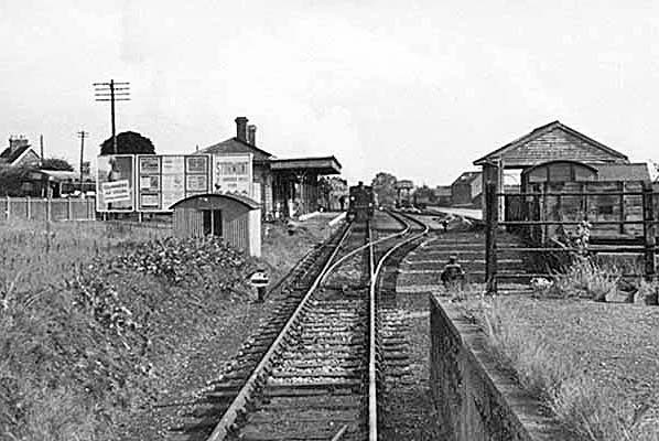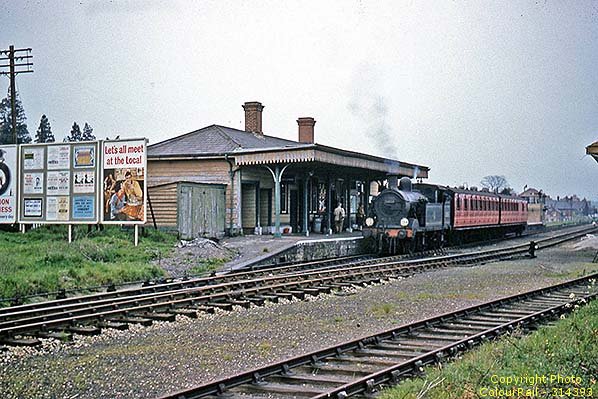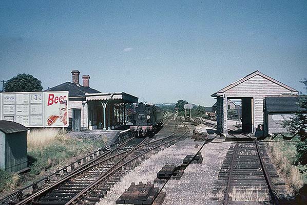![]() A general view dating from 1961 of Westerham station, goods shed and yard taken from the dock area. The by-then-usual Class H tank and Maunsell push-and-pull set is present as is yet another version of the beer campaign advertisements.