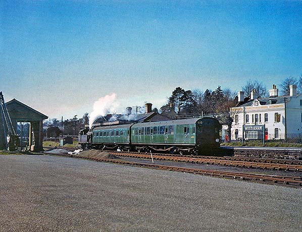 Photo from Jim Lake collection ![]() On Saturday 11 March 1961 an unidentified Class H tank is seen at Westerham with Maunsell set No.610. Despite the disc on the front of the driving trailer, the direction of the plume of steam from the locomotive's safety valves, plus that drifting over the carriages, suggests the train is arriving rather than departing. On the left the goods shed, empty again is seen, and the yard's 5-ton crane.