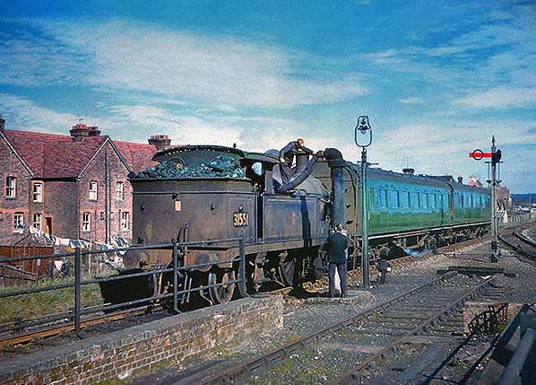 Photo by Graham Hoare ![]() In March 1961 Class H No.31551 takes on water at Westerham. An advantage of push-and-pull trains is clear from this image; it was not necessary at Westerham and many other locations to uncouple the locomotive from the train and run round the loop to reach the water crane. The push-and-pull set is probably No.610, this being the usual Maunsell set seen on the branch. The set appears nice and clean but the pleasantness, or otherwise, of the unlined Southern green livery was a matter of opinion. The Southern Railway and British Railways used several different shades of green and which shade was which remains a complex issue to this day. In the foreground is the site of the one-time engine shed and to the right the well-known ringed shunt signal; the brick wall is the base of the shed. Note the washing hanging out to dry on the left; in the days of steam locomotives and belching factory chimneys smuts were always a problem. Housewives grumbled but by and large the risk of washing being soiled by smoke and smuts was accepted as part of life. 'Smuts' means particles of soot or ash and is a word seldom heard nowadays.