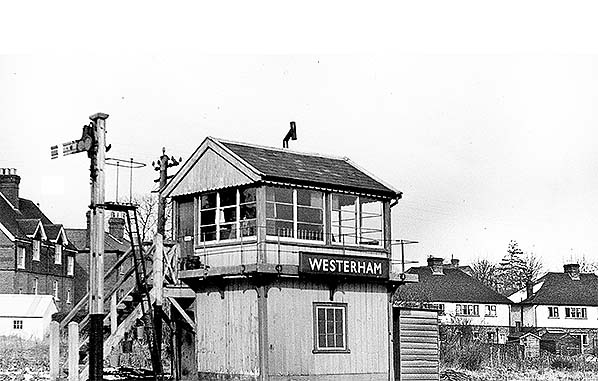 elsewhere in another caption. Photo by JL Smith ![]() The Stevens signal box and Southern style starting signal seen here circa 1960. The tops of the levers can be seen through the windows of the box. In BR days, the signal seen above was known as the 'Up Main Starting' and was controlled by lever 13. Its position was given as being 15yd from the centre of the signal box. In the view above, this distance appears rather less than 15yd so whether the signalling diagram was inaccurate or if the signal had been moved at some point, perhaps when the original signal was replaced by that seen above, is not clear. Westerham once also had an 'Up Advanced Starting' signal, controlled by lever 7, but its precise location is unrecorded. It was likely to have stood in the vicinity of the water crane or slightly beyond. This Advanced signal was abolished at an unknown date and lever 7 subsequently controlled the points to the back siding. In Southern Railway days locking was both electric and mechanical but in BR days it appears to have been exclusively mechanical. Advanced signals were provided for occasions when a train had to draw forward for any reason beyond the Main Starting signal or was too long to be controlled by the Main Starting signall'