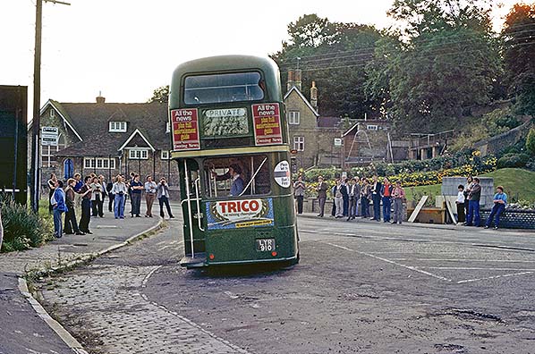 We have all heard of the proverbial 'face like the back of a bus' but at Westerham on 31 August 1980 the real thing was on show as preserved RT 3491 waits at the bus stop adjacent to the site of Westerham station. Westerham primary school can be seen in the background and the station site was off the picture to the left. Note the cobblestones, which may well have dated from the time Westerham station was built. The bus stop sign on the left is visible in numerous photographs but by August 1980 the iconic London Transport flag had been replaced by a functional but rather bland National Bus Company (NBC) example of the type which became familiar across the country. It bears a Green Line sticker complete with NBC logo. Below the Green Line sticker are further stickers informing the public of routes serving the stop; 410, 483, 485 and 705 with the latter being the Green Line Sevenoaks - Windsor service. However, not all is what it seems as by the time the above photograph was taken the 705 had been reduced to just one weekday evening Tunbridge Wells - Westerham journey and a Sunday service to Windsor before disappearing entirely. The former London Transport country area, including Green Line, had been hived off in 1970 to become part of the NBC. The resulting outfit became London Country Bus Services Ltd until it too vanished following bus deregulation in 1986. Green Line still exists as of February 2016 but is a sad shadow of its former self. For much of its existence, Green Line was billed as a coach network and although a number of proper coaches did exist prior to deregulation (albeit usually in the form of coach seats fitted in what was essentially bus bodywork) most routes were operated by ordinary buses in Green Line livery but sometimes with semi-coach seating, heaters and, in the case of some double-deckers (the RMC and RCL types for example), platform doors. Perhaps the best description might be 'limited stop bus services often using vehicles of dual-purpose layout'. That said, Green Line vehicles offered a rather more pleasant travelling experience than the vile, cramped and often stuffy coaches of today with their nausea-inducing soft suspension, funny goings-on at the back seat and constantly blaring radios invariably tuned to suit only the driver. Back at Westerham, the rear blind of RT 3491 is set to 'Private'. London Transport took advantage of their large destination displays to advertise bus and coach hire in these instances. The wording below 'Private' read "To hire a bus or coach, apply 55 Broadway S.W.1 or any local garage". Slipped into this wording was the telephone number 'Abbey 5600', the number of 55 Broadway. This telephone number was from the 'Director' dialling system which predated the London 01 code and subsequent 071, 081 and 020 codes. The Director dialling system was used in many large cities and was the original reason for telephone dials having letters as well as numbers. To dial a number one would first dial the code which, in the case of Abbey 5600, was ABB and then the number. Code ABB equated numerically to dialling 222. Thus when the 01 dialling code for London was introduced one would dial 01 222 5600 from outside London or 222 5600 if within London. Under the present system the number for 55 Broadway, or rather one of them, has become 020 7222 5600. In 2015 55 Broadway, a rather splendid Art Deco building which opened in 1929, lost its final link with London Transport when London Underground vacated to new premises in the Docklands area. Curiously, dialling codes in the Director era were usually stated in capital letters, for example ABBey 5600, but as seen on RT 3491 the entire exchange name was given in capitals. It will be noticed that the preserved RT 3491 in 1980 was well adorned with advertisements. This was once common on preserved buses; sometimes the advertisements were purely for historical effect and served no commercial purpose while sometimes the opposite was true and the practice helped provide revenue towards the expensive upkeep of preserved vehicles. The round advertisement on the offside rear corner said "Please let the Bus Go First". This request, with various wordings, was once a common sight on buses all over the country and back in the days before other drivers always had to be somewhere yesterday the request was usually granted. In fairness many of today's drivers do let buses pull out but impatience often means buses have to start nudging forward before being let out.
