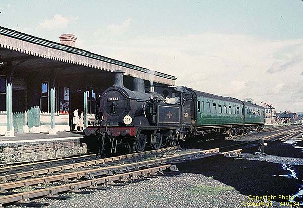 Copyright photo from Colour Rail 340034 ![]() This view could have been taken at any time in the final few years of the branch but the enthusiasts give away the fact it is another view from the final day of service, 28 October 1961. The train is Class H No.31518 and Maunsell push-and-pull set No.610. This train operated services until the afternoon when the main line stock and D1 and Q1 locomotives took over although there does appear to have been some overlap, possibly because of duty rosters. This is actually the 2.01pm arrival from Dunton Green which was due to depart at 2.23. This area of the goods yard, foreground, was rather tidier then elsewhere around the site and no doubt because this part of the yard saw more staff
