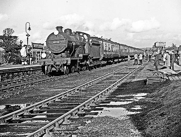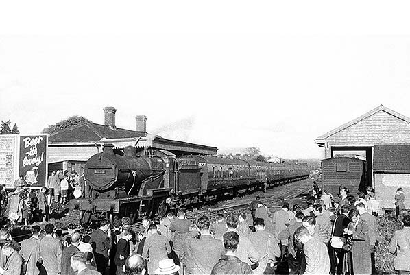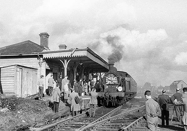 Photo by Ian Nolan from his Flickr photostream ![]() On the last day of service, 28 October 1961, D1 4-4-0 No.31739 has arrived at Westerham following its first run of the day from Dunton Green. A large crowd of railway enthusiasts and other interested observers has gathered, many of them probably having arrived on the train. Some uncertainty surrounds the length of set 277, which was normally a '10-set', with some sources stating it was 6-car length. On enlargement of this photograph it was clearly 7-car. Bulleid Q1 No.33029 also took its turn on the branch alternating with the D1 and with the swapping undertaken at Dunton Green. Readers are reminded the trains operated by the D1, Q1 and set 277 were not specials but normal service trains. Saturday 28 October 1961 was the final day that year of British Summer Time, the clocks being put back one hour during the night of 28/29 October. The final push-and-pull train on the final day of the Westerham branch was operated by Class H No.31518 and numerous photographs of it exist with a suitable smokebox inscription. Less well known is that Class H No.31324 also did a turn on the branch on the final day. Photo by David Pearson Click here for Westerham Station Gallery 8: