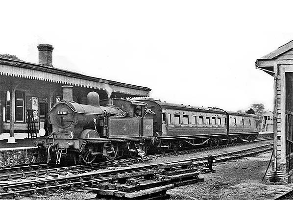 Photo from John Mann collection ![]() Class H 0-4-4T No.31308 waits at Westerham while working Tonbridge duty 309. The photograph was taken during the last few weeks of operation. The locomotive was reallocated to Tonbridge, the shed responsible for operating the branch in February 1961. The locomotive had previously been at Brighton shed, from where duties may have included to Horsham via Steyning, to Hailsham and perhaps to Tunbridge Wells West. The child is supposed to be admiring the locomotive or trembling in fear at the sound of the Westinghouse pump but instead is more interested in the camera. The hand-painted lettering on the bufferbeam is unclear but what little can be made out appears to refer to jumper controls. Whatever it says it will apply to the two air pipes beneath it. These were the pipes for the push-and-pull control gear which, when connected, would be carried through to the driving cab at the outer end of the train. Westerham branch locomotives normally operated smokebox-first to Westerham so in this case identical connections on the other end of the locomotive would be connected to the train. The push-and-pull control system used by the Southern was that devised by the LB&SCR and was superior to the vacuum system and infinitely superior to older systems using mechanical linkages. On the right of the image, part of the goods shed is visible and complete with advertisements which, one hopes, were designed to be read easily from the platform.