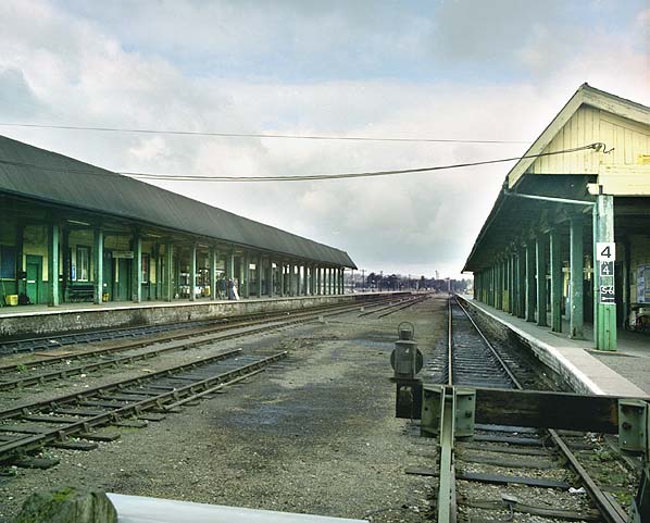 Weymouth station looking north from the buffer stops in March 1983. This was shortly after it was announced that the station was going to be rebuilt. One of the storage roads has been lifted and another has been partly lifted. Within 3 years everything in this view will have been demolished.