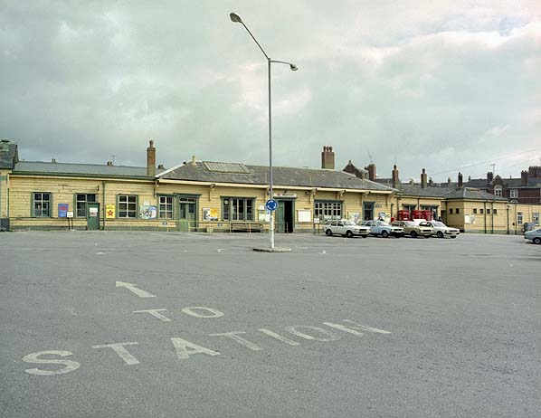 The deserted Weymouth station forecourt in March 1983. The buildings date from the opening of the station in 1857.Four taxis are lined up awaiting the arrival of the next train