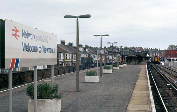 The rationalised Weymouth station looking north along platform 2 towards the buffer stops in July 1987. Corporate Identity has given way to Network SouthEast signage, and 1980s-style Southern Region lamps have been installed