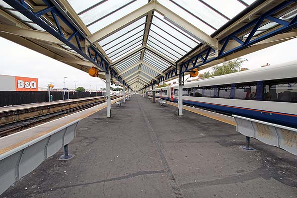 Weymouth station looking north along platform 2/3 in July 2013. A Class 444 Desiro electric multiple-unit waits at platform 3. The B & Q store on the left is on the site of the goods shed.