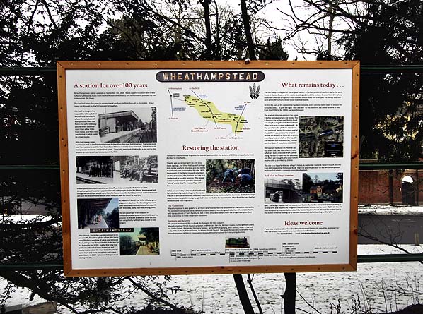 Interpretation board on the restored Wheathampstead station platform in December 2010.