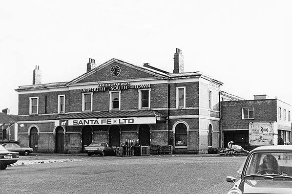 South Town station building in July 1976 when in use by an offshore oil and gas exploration company. It is perhaps surprising that the station name remained in situ after closure and one wonders if anybody was fooled by it and thought that they could still catch a train. Photographs taken after closure suggest that the clock carried on working, but then it was probably an electric (synchronous) clock so unless deliberately disconnected it would have done. On the right stands a former BR 'door to door' container (the brand name was styled in lower-case lettering) with relevant logo of which part can only just be discerned. Its colours varied according to background and the logo also appeared on the BR road vehicles used to deliver containers to and from customers when, in the days of yellow road vehicles, it was black and red.